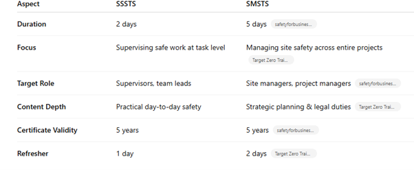 responsibility, so the right choice depends on your current role and where you want to go next in your career. Ultimately, choosing between SSSTS and SMSTS comes down to your current responsibilities and your future ambitions within the construction industry. If you're stepping into a supervisory role and want to strengthen your ability to manage teams safely and effectively on site, SSSTS is an excellent starting point. However, if you are already managing projects or aiming for a site management position, SMSTS will provide the broader knowledge and leadership skills required to oversee site safety, planning and compliance. Whichever path you choose, investing in recognised health and safety training is a positive step towards building a safer working environment and advancing your professional development.